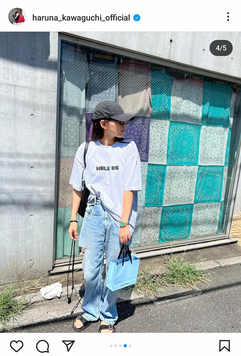 川口はTシャツ姿でキャップを被った眼鏡姿であんみつを食べる姿を披露。その左手にはターコイズの文字盤とゴールドの腕時計がキラリ。川口自身の、ブルーのハートマークの文字を添えていた。