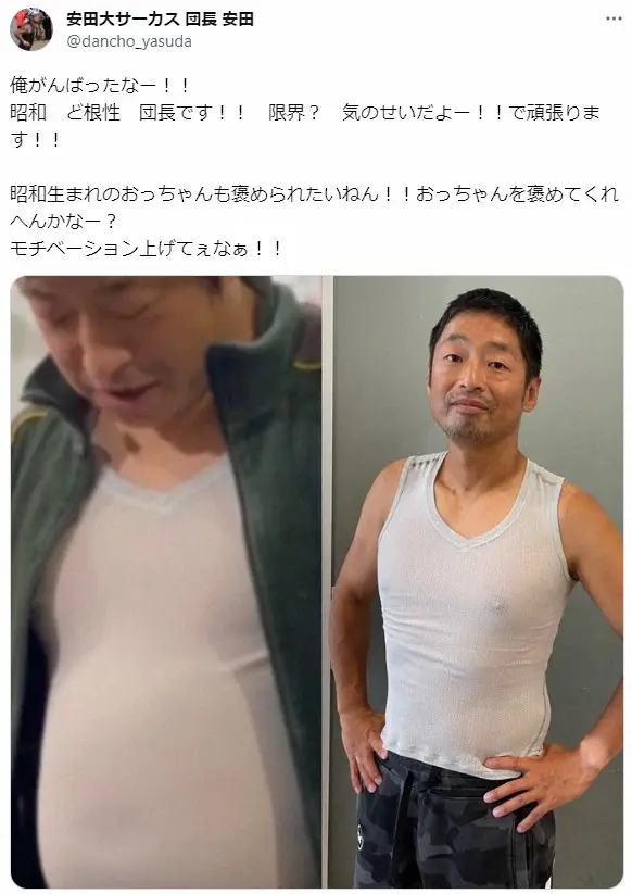 安田大サーカス・団長安田 Photo by スポニチ 「安田大サーカス」団長安田 激ヤセ「俺がんばった」3カ月で13キロ減 「… ギャラリーで見る この記事のフォト 2023年07月19日の画像一覧 もっと見る 2023年07月19日の画像をもっと見る