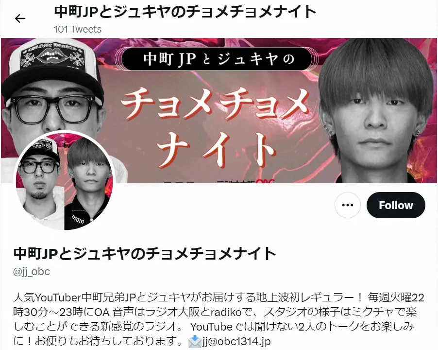 ラジオ大阪「中町JPとジュキヤのチョメチョメナイト 」ツイッター(@jj_obc)から