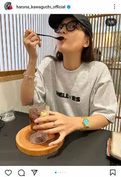 川口は、18日にシャツ姿でキャップを被った眼鏡姿であんみつを食べる姿を披露。その左手にはターコイズの文字盤とゴールドの腕時計がキラリと輝いていた。