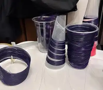 「影で見てもシルエットがハッキリ分かるドリルの様な縦ロールを作るのにこだわりました。縦ロールの表面のツヤを出すため、太さを調整した毛束を一度水溶きボンドで真っ直ぐ伸ばして、乾かして貼り付けての繰り返しです。