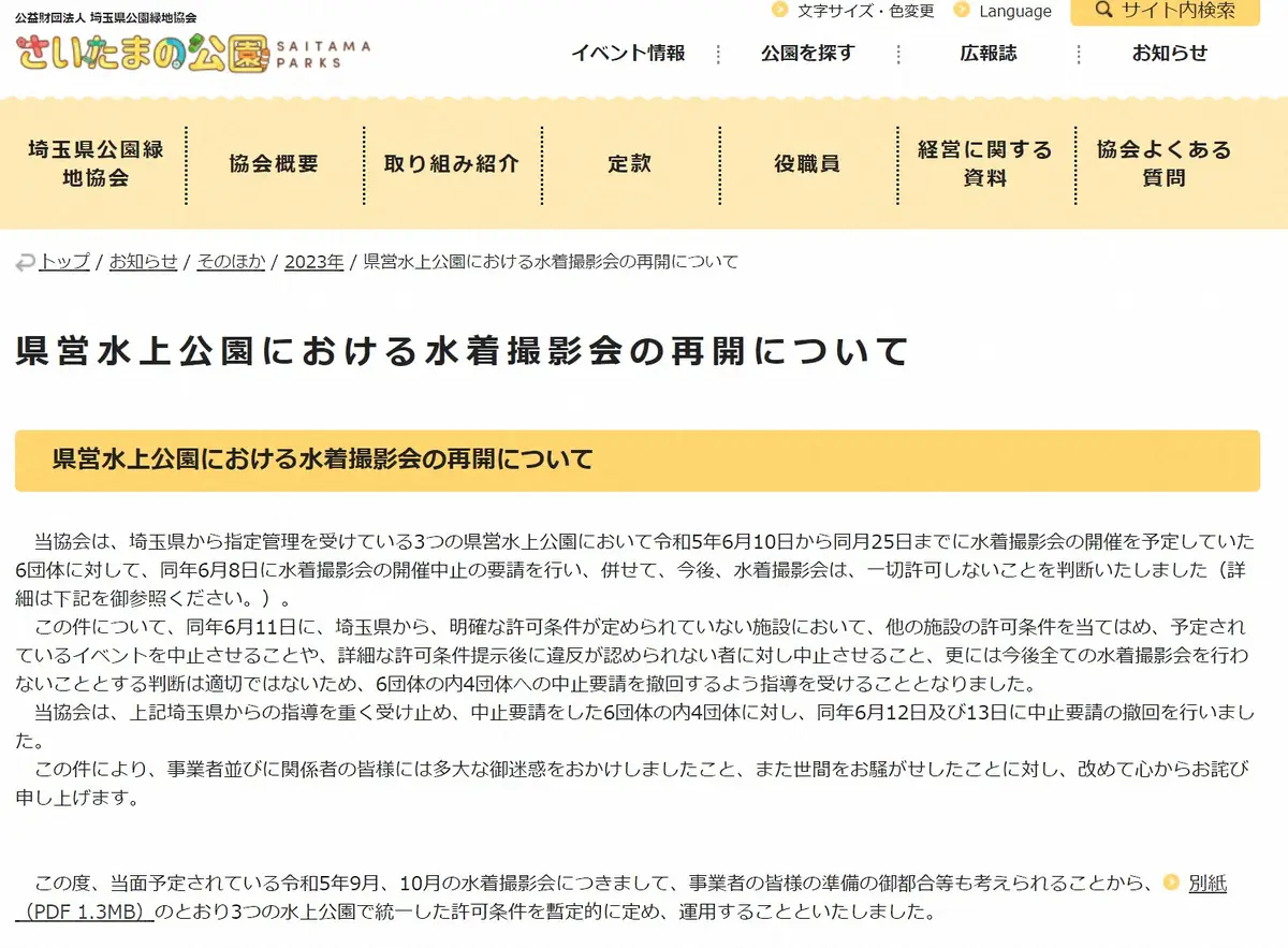 同協会はホームページ(HP)に「県営水上公園における水着撮影会の再開について」と題した文章をアップ。「3つの水上公園で統一した許可条件を暫定的に定め、運用する」とし、ルールの詳細を記した「水着撮影会開催許可条件」を発表した。