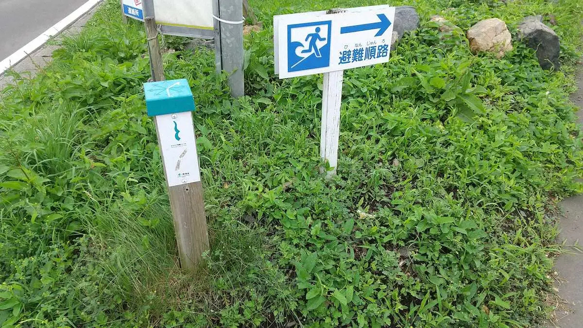 道はやがて自動車道と合流。「みちのくトレイル」の道標を頼りに進む。「避難順路」の標識が並んで立っているのはこの地も東日本大震災の津波に洗われたことを物語る。