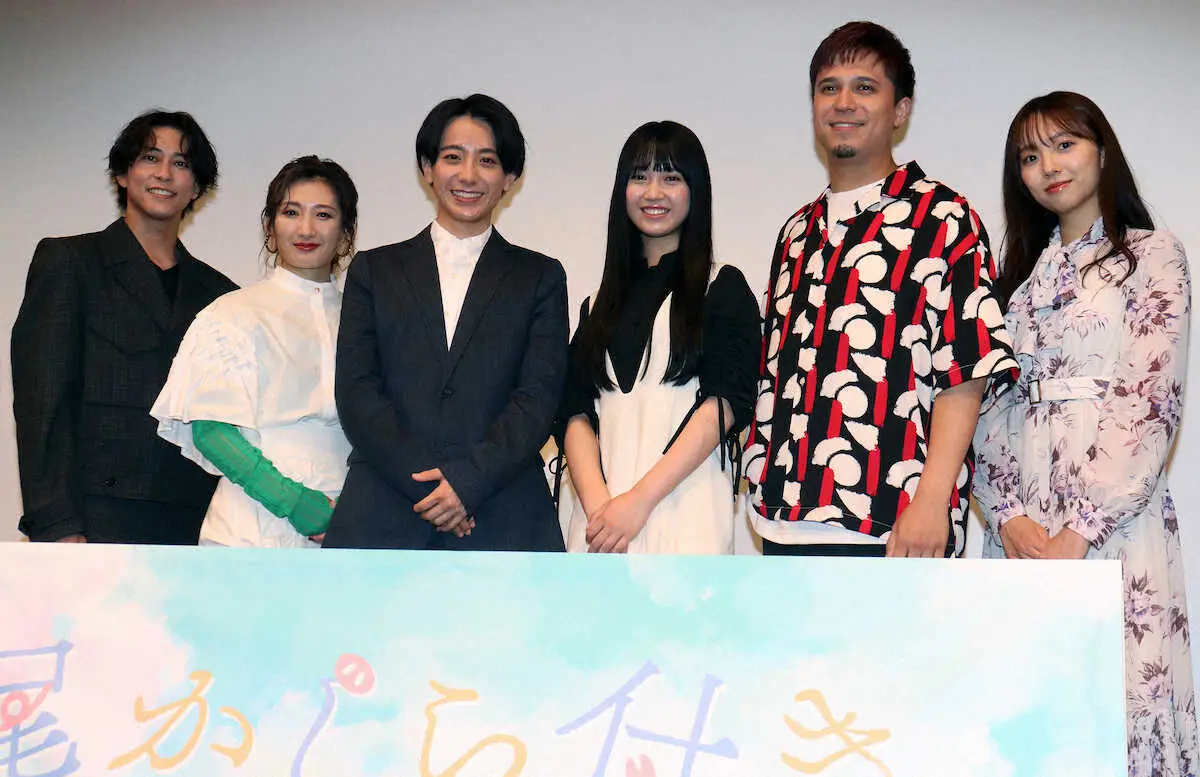 映画「尾かしら付き。」の完成披露上映会に出席した(左から)佐野岳、武田梨奈、小西詠斗、大平采佳、木村昴、新内眞衣