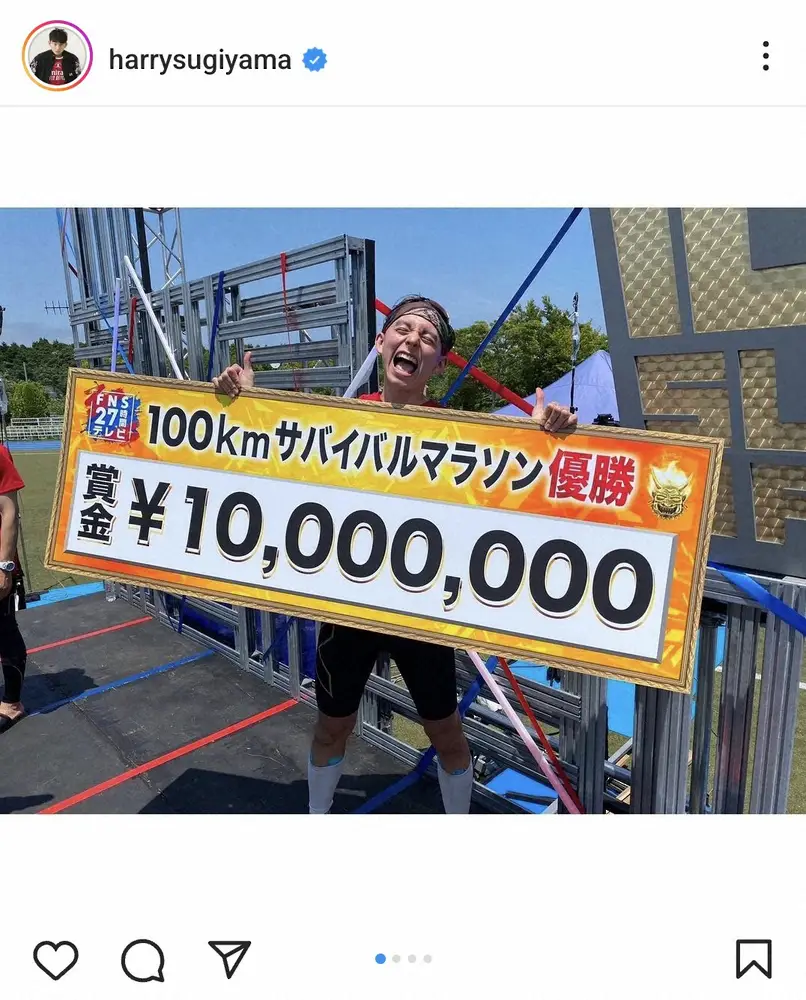 タレントのハリー杉山(38)が23日、自身のインスタグラムを更新。22、23日に放送された大型特番「FNS27時間テレビ」内の通し企画「100キロサバイバルマラソン」で優勝したことについての思いを語った。