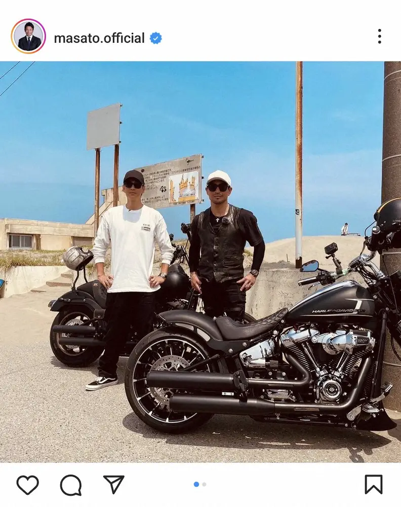 「三浦翔平くんとツーリング!今日魔裟斗チャンネルで配信します!」とつづると、白のキャップ、サングラスに黒のTシャツ、インナー、ベスト、黒のパンツ姿の自身が愛車、ハーレーダビッドソンの「ブレイクアウト ブラックデニム」の後ろに立ち、黒のキャップにサングラス、白のロングTシャツ、黒のパンツ、スニーカー姿の三浦が愛車をバックにして並ぶショットを披露した。三浦の愛車もハーレーダビッドソンの「ソフテイル FXLRS ローライダーS」であることが知られている。