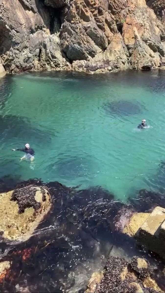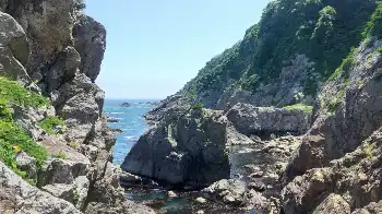 奇岩に囲まれるようにしてできたコバルトブルーの入り江にはウニのじゅうたんができているのか?