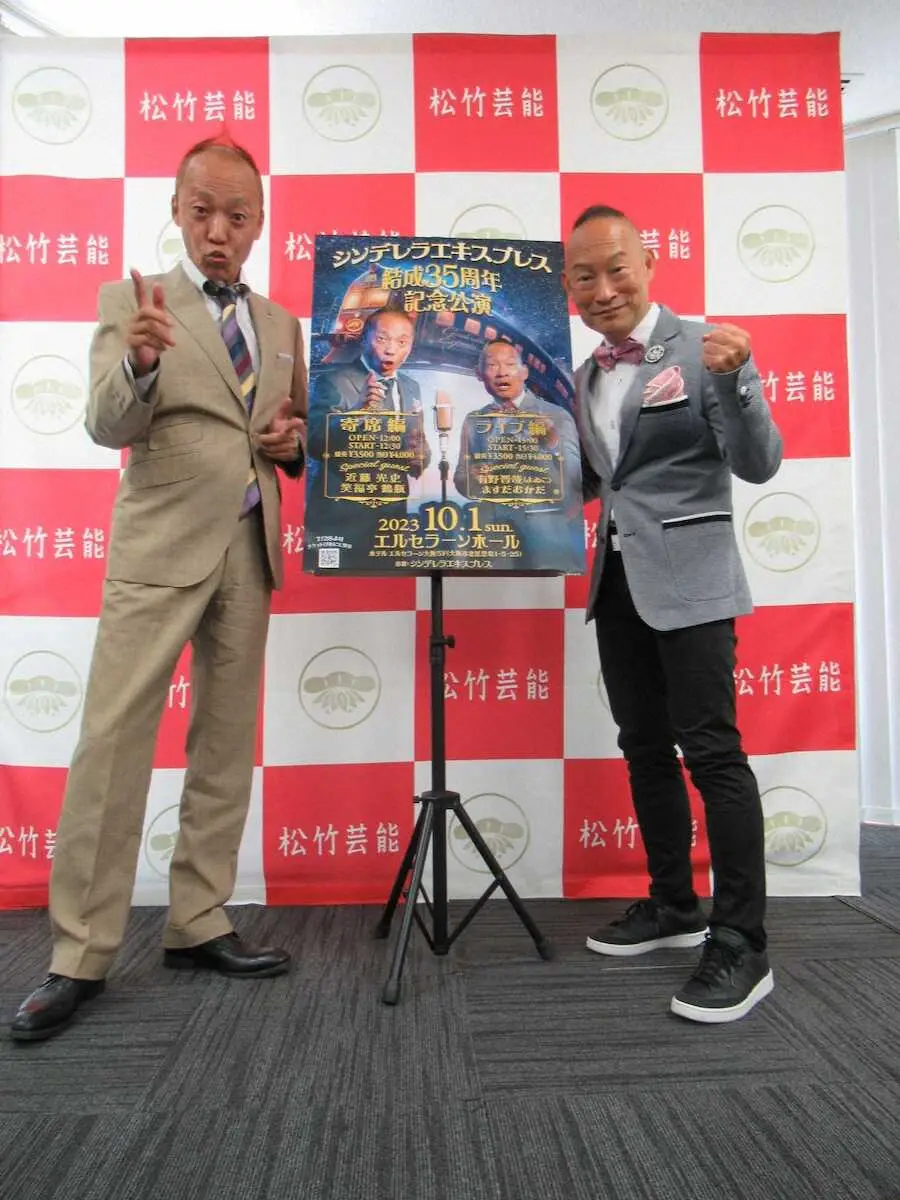 お笑いコンビ「シンデレラエキスプレス」の松井成行(58)、渡辺裕薫(55)は24日、大阪市内で「結成35周年記念公演」(10月1日、大阪・堂島エルセラーンホール)の発表会見に出席。同公演の特別ゲストに落語家・笑福亭鶴瓶(71)、ラジオパーソナリティの近藤光史(76)、よゐこ・有野晋哉(51)、ますだおかだの増田英彦(53)、岡田圭右(54)ら豪華メンバーが出演することを発表した。