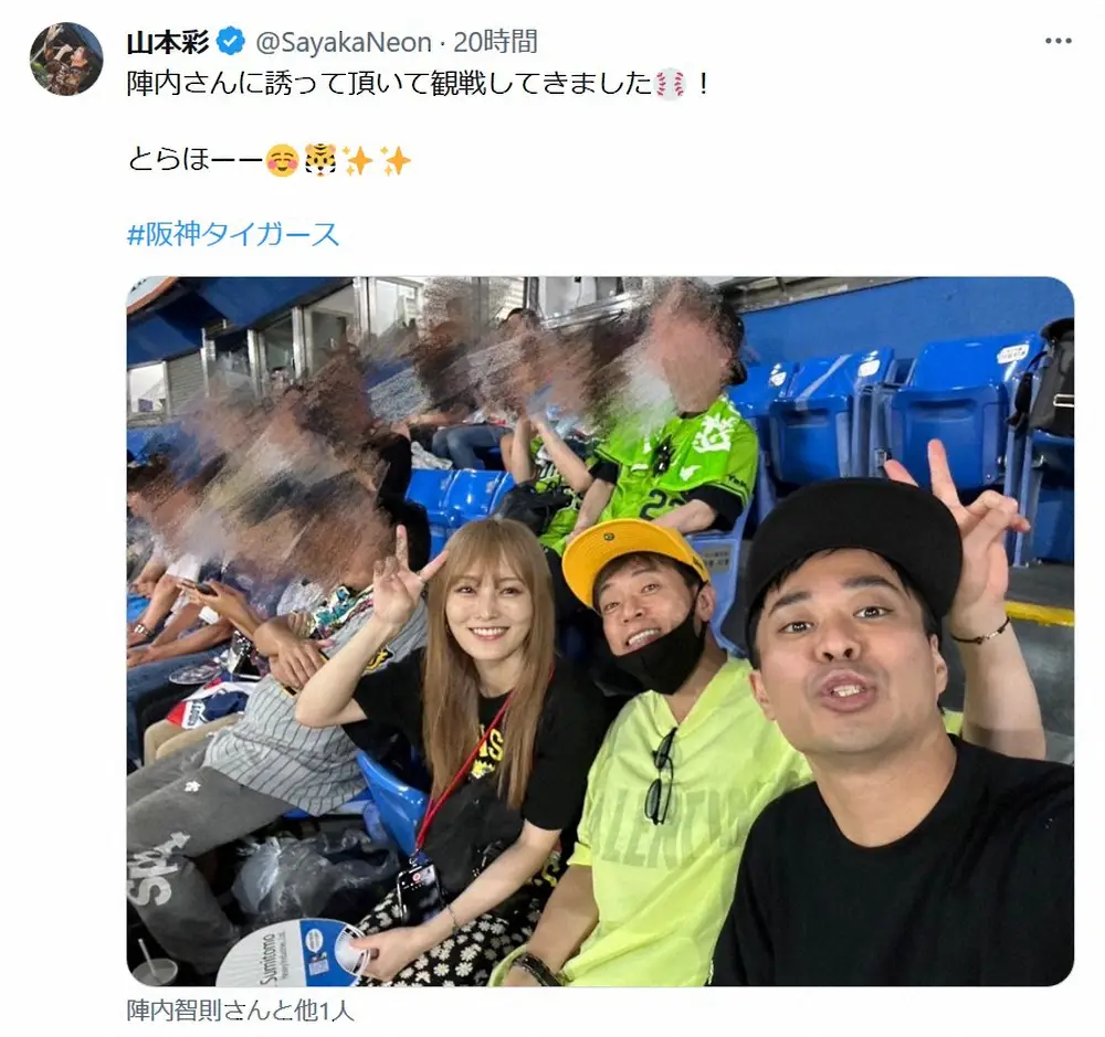 元NMB48でシンガー・ソングライターの山本彩(30)が24日までに自身のツイッターを更新。お笑いタレントの陣内智則(49)らと阪神戦を観戦したことを報告し、観戦ショットを披露した。