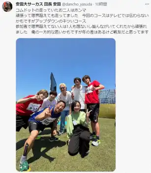 団長は、ツイッターに妻でフリーアナウンサーの安田さちと、コムドットの5人との記念ショットを投稿し「コムドットの走っていたお二人はホンマ頑張って限界超えても走ってました」と吐露。「今回のコースはテレビでは伝わらないかもですがアップダウンのキツいコース」といい、「参加者で限界超えてない人は1人も居ないし皆んながいてくれたから頑張れました」と感謝。「俺の一方的な思いかもですが年の差はあるけど戦友だと思ってます」と、コムドットを“戦友”と記した。