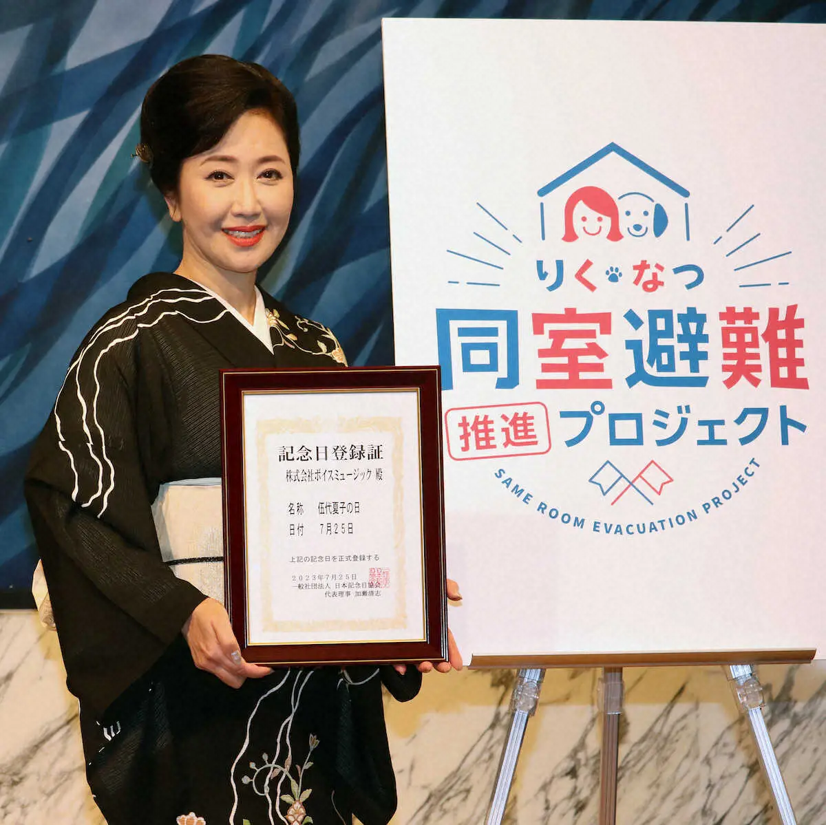 演歌歌手の伍代夏子(61)が25日、都内で「りく・なつ同室避難推進プロジェクト」のアンバサダーに就任したことを発表。災害時などに人とペットが一緒に避難所に入れる環境を目指す運動でプロジェクト名は愛犬と自身の名前を使用。「まずは受け入れてくれる場所の確保が目標。ペットを飼っている歌手仲間にも声をかけて広げていきたい」と抱負を語った。また、この日が「725(なつこ)」の語呂合わせで「伍代夏子の日」に認定されたことも発表した。