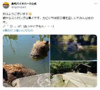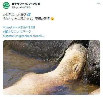 また、「朝からストロングな暑さです。カピたちは展示場を空にしてみんな水の中…」「ぬっかとやもん…」と長崎弁でカピバラを思いやったのは、長崎県の長崎バイオパーク。静岡県の富士サファリパークからは「冷た~い水に浸かって、至福の表情」と、目を閉じて気持ちよさそうにしている様子が報告された。