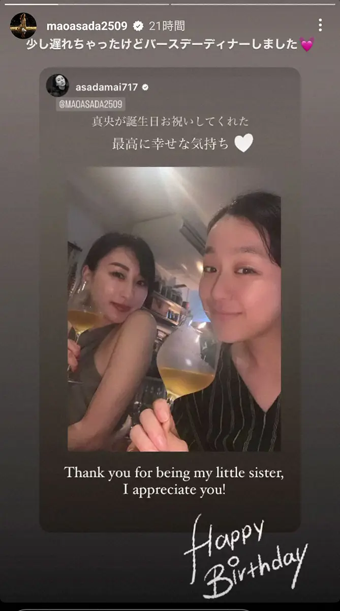 浅田舞公式インスタグラム(@asadamai717)から 浅田真央さん 姉・舞の35歳の誕生日祝福 舞も「最高に幸せな気持ち」 ギャラリーで見る この記事のフォト 2023年07月27日の画像一覧 もっと見る 2023年07月27日の画像をもっと見る