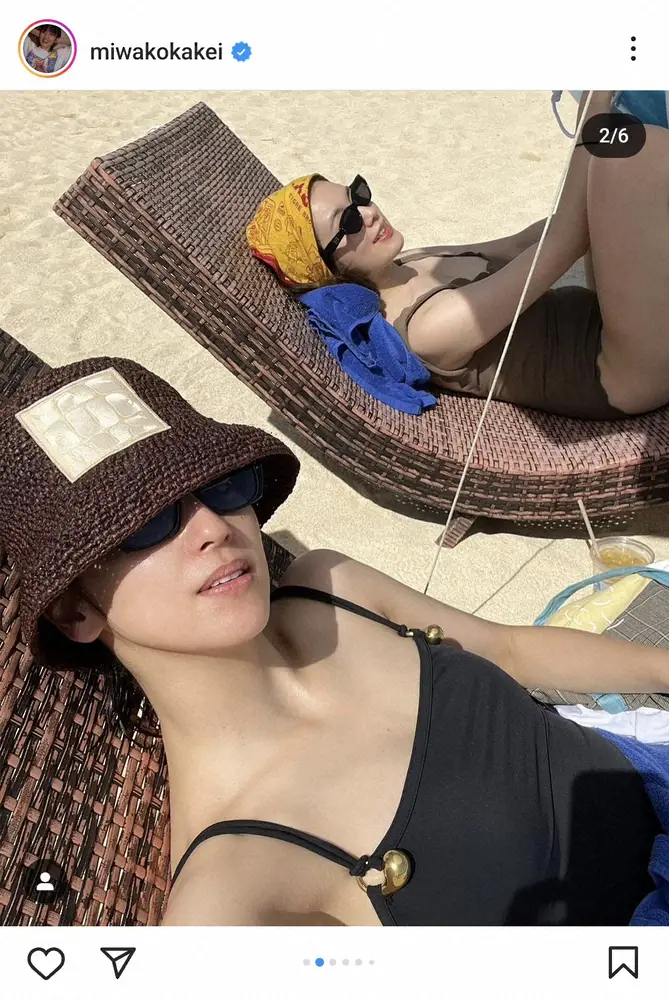中村はインスタグラムに亀、サンゴ、シュノーケルなどの絵文字とともに「@miwakokakei」と記すと、茶色のバケットハットに黒の水着姿でビーチに自身が横たわる後ろ姿をアップ。ビーチのパラソルの下でビーチチェアに筧がスカーフ、サングラス、茶色の水着姿でくつろぐショットも披露した。ツイッターには「夏休み」と添えた。