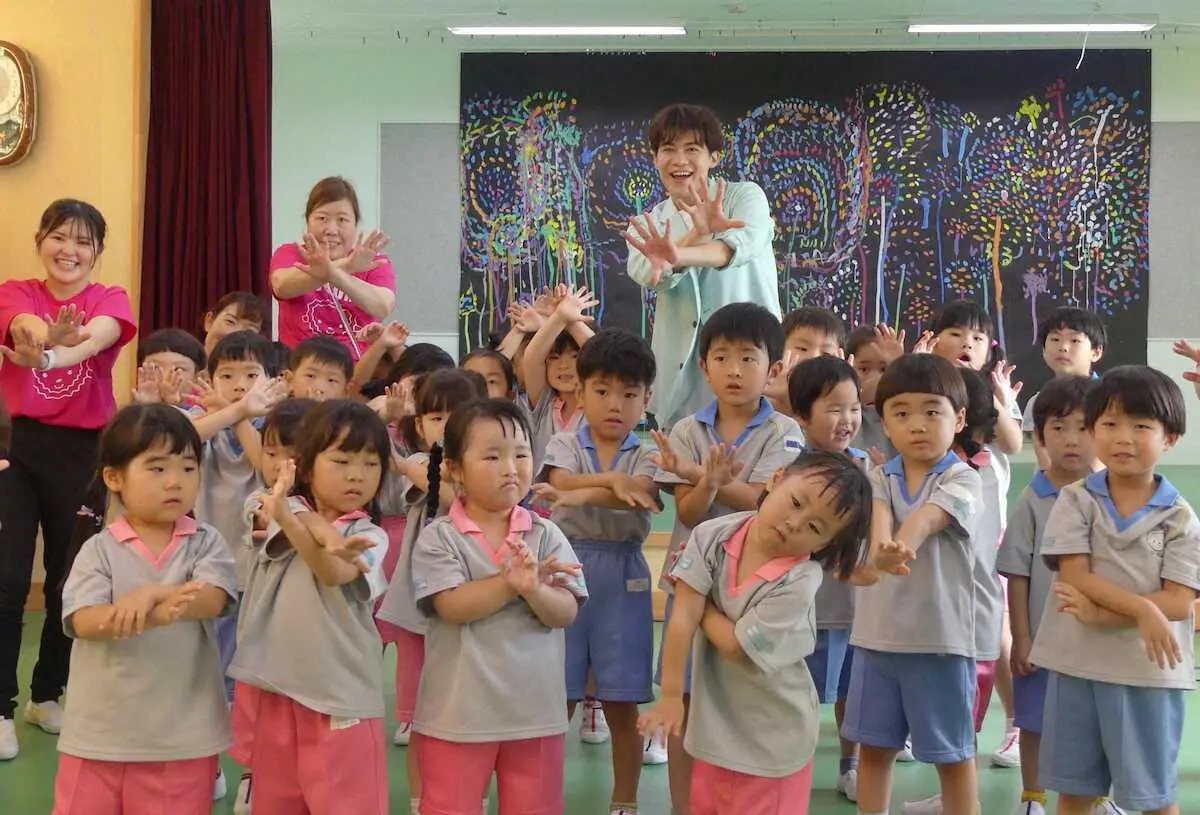 曲は人気アニメ「名探偵コナン」のスピンオフ作「名探偵コナン 犯人の犯沢さん」の主題歌に起用されヒット。両手を体の前に出し、円を描くように動かすキャッチーな“窓ふきダンス”が話題になり、TikTokではヒットの基準とされる1000万回の3倍以上となる約3200万回再生を記録。今回は幼稚園児とその父母向けのフリーペーパーとコラボし、同幼稚園に訪れた形だ。