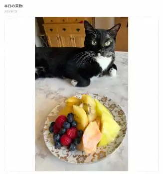 「マル坊とフルーツ」というタイトルで、撮影中の藤をじっと見つめる飼い猫の「マル」には、「マル坊 カメラ目線バッチリ イケメンだね-」とコメント。その前には、彩り鮮やかに盛り付けられた、果物満載のプレートが置かれている。