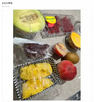 「朝は必ず果物をたくさん摂取します」とつづり、メロン、ぶどう、パイナップル、キウイ、ラズベリーなど、たくさんの果物が常備されている様子。「これだけ頂いたらお腹いっぱいになるけど水分だから大丈夫~」「美味しかったぁ」と、感想を続けた。