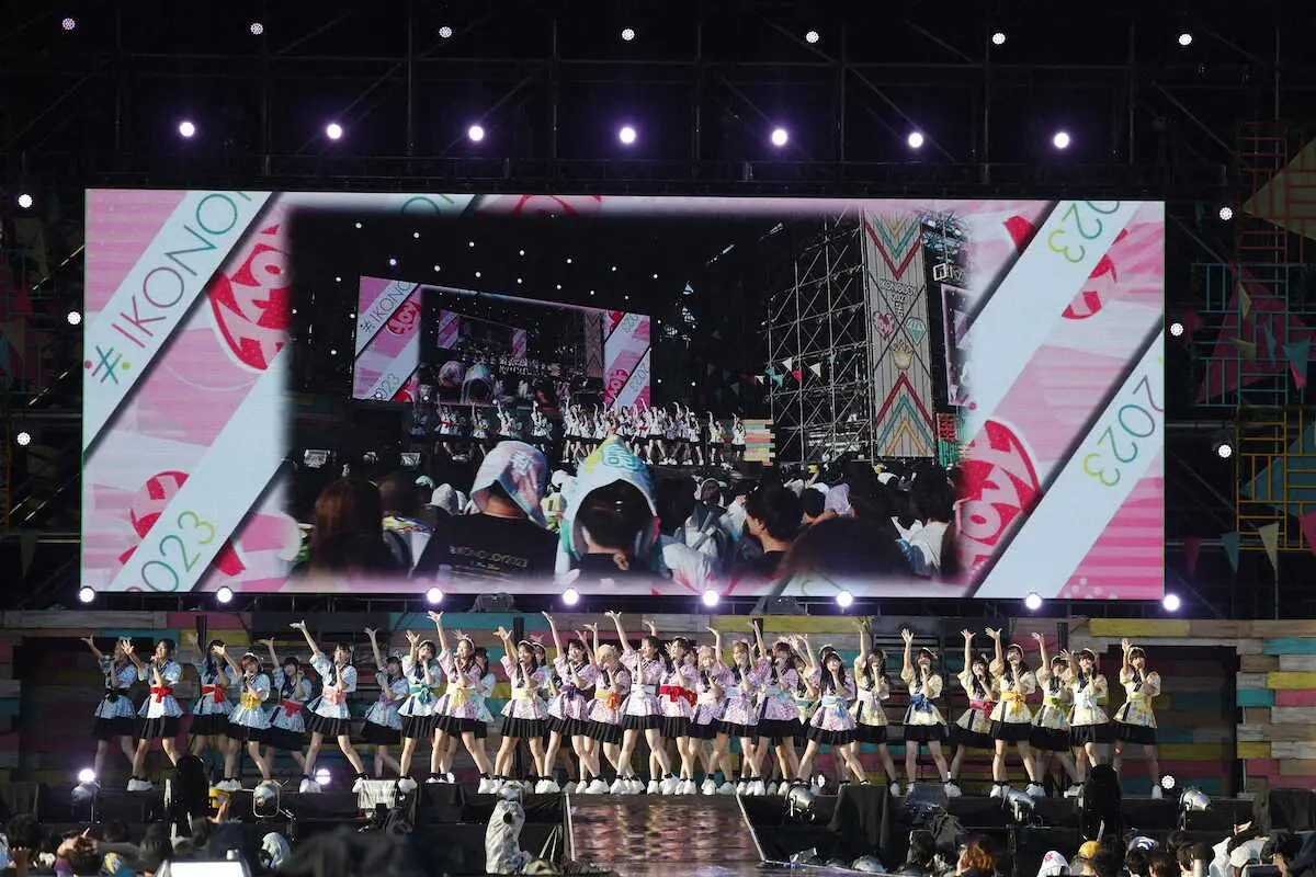指原莉乃(30)がプロデュースするアイドルグループ「=LOVE」、「≠ME」、「≒JOY」の合同フェス「イコノイジョイ2023」が29、30の両日、山梨県の富士急ハイランド・コニファーフォレストで行われた。2日目は、3組の合同曲「イコノイジョイ」でオープニング。「シャッフルパーティー」と題し、≠MEの「ピオニーズ」を=LOVEの佐々木舞香(23)と野口衣織(23)が歌うなど、グループの枠を超えた総勢34人による全28曲のパフォーマンスでファンを魅了した。