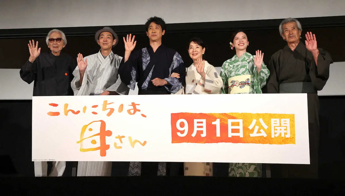 連日の酷暑。映画のラストシーンに絡めて舞台後方の3連ビジョンに花火の映像が映し出される中、吉永はじめ息子役の大泉洋(50)、孫を演じた永野芽郁(23)、さらに田中泯(78)、宮藤官九郎(53)ら共演者たちも涼やかな浴衣姿で登壇した。