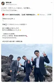 この日、スタートの日本テレビ系連続ドラマ「彼女たちの犯罪」(木曜後23・59)の公式Xが、「刑事トリオのオフショットをお届け!」と、崖でピースサインをして笑顔を向ける石井杏奈、鈴木康介、野間口の3ショットを投稿していた。