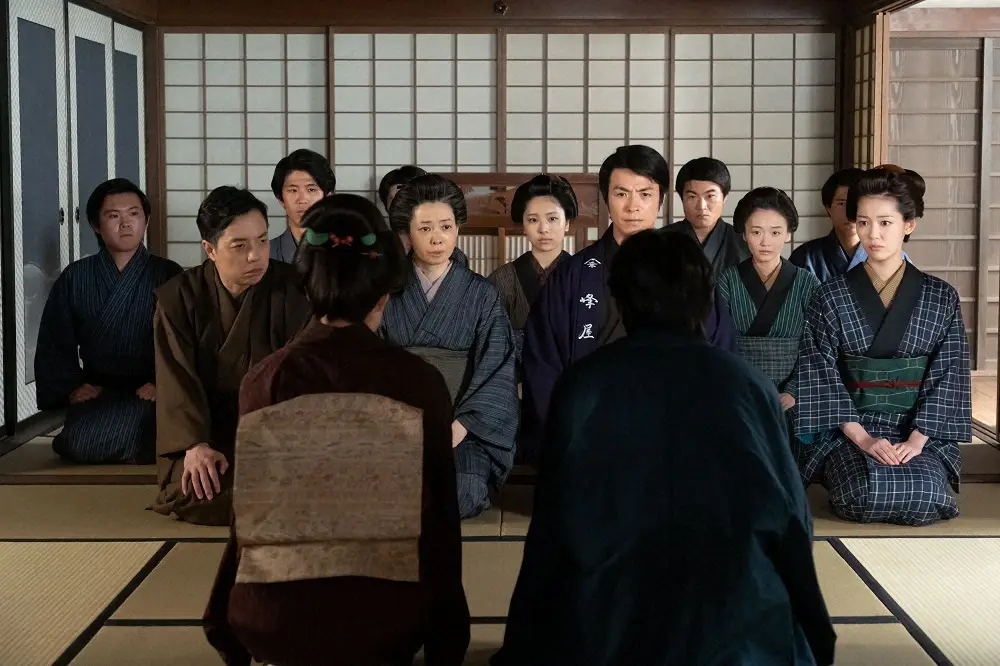 連続テレビ小説「らんまん」第89話。(手前左から)綾(佐久間由衣)と竹雄(志尊淳)の苦渋の決断に、峰屋の一同は…(C)NHK