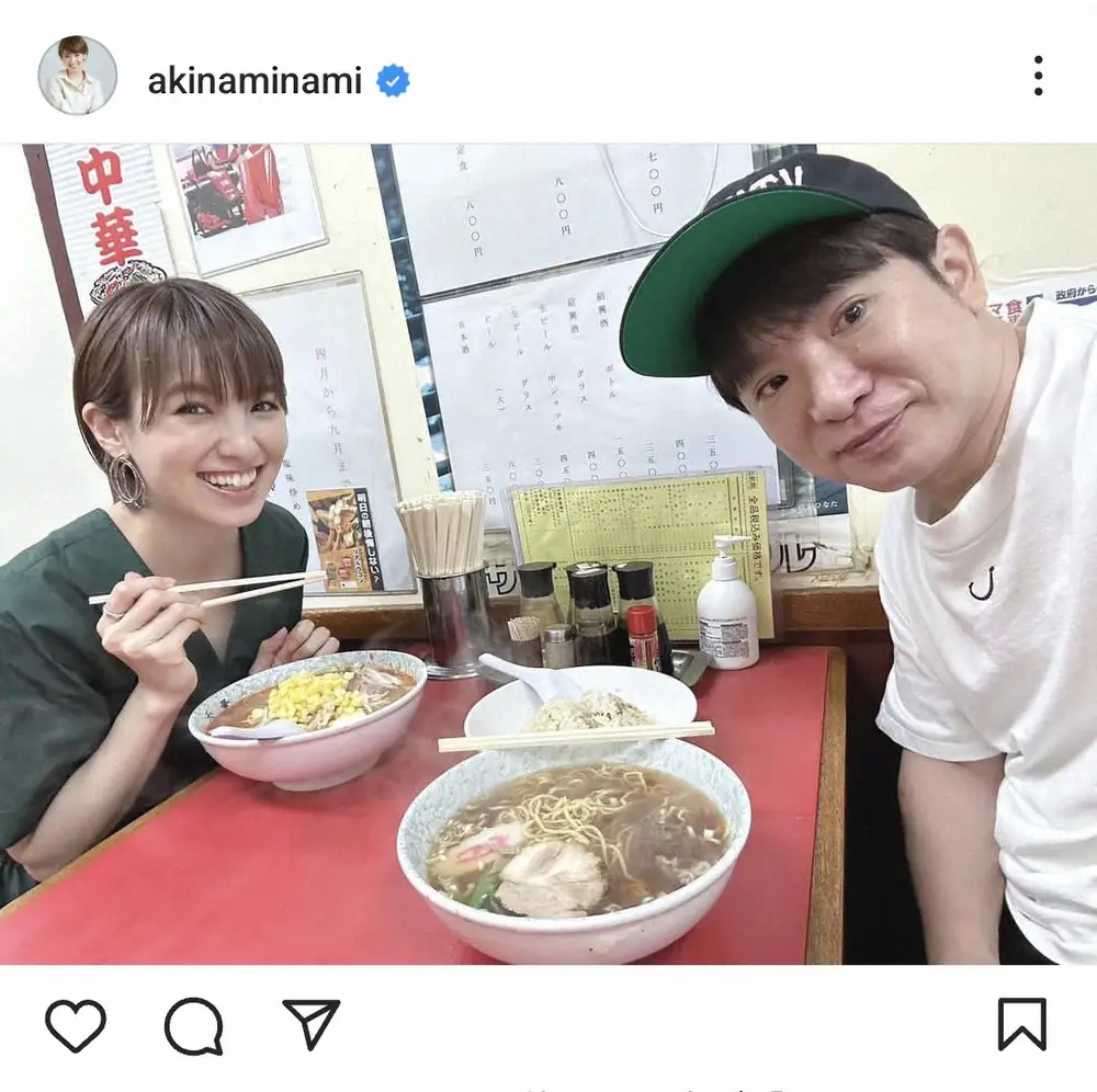 南の投稿に、フォロワーからは「なかよしだぁ」「夫婦の時間も、貴重ですよね」「ラーメン美味しそう 2人ともいい笑顔」「あっきーな可愛い」「仲好し夫婦、二人を見るとホッコリします」といった反響が寄せられている。