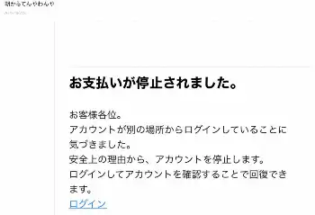 送った後に「これ、詐欺じゃないかと不安がよぎり、メールの送信元を見てみたら ものすごく変なアドレスで、おまけに一斉メールでした。急いでカードを止めてもらうべく銀行に電話をして今、全て終わったところです」とつづり、「お支払いが停止されました お客様各位。アカウントが別の場所からログインしていることに気づきました。安全上の理由から、アカウントを停止します。ログインしてからアカウントを確認することで回復できます」と書かれたメールの写真を投稿。「もう 悪いことしちゃダメだよと思いました。今朝は肉を食べた後だったので、手続きもあまりドキドキせずにやり遂げることが出来ました」とした。