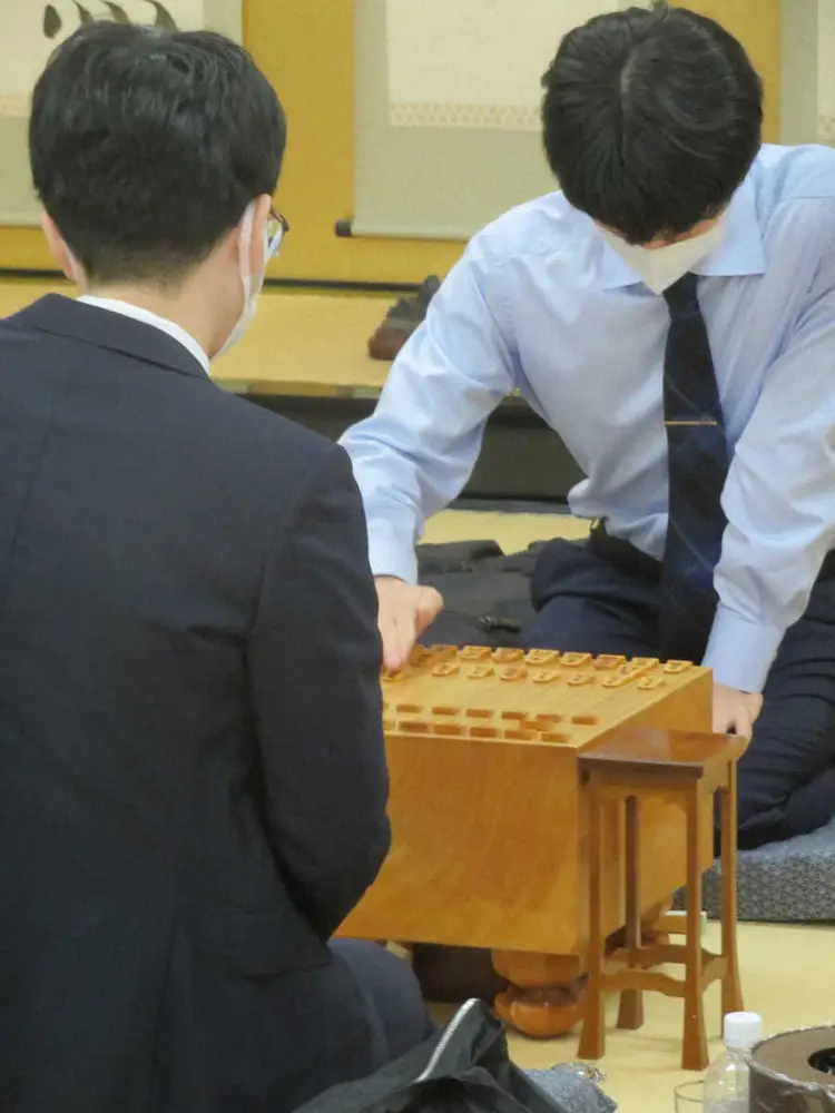 豊島将之九段(左)との第71期王座戦挑戦者決定戦で初手を指す藤井聡太王将