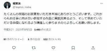 俳優稲葉友(30)がタレント藤田ニコル(25)との結婚を発表してから一夜明けた5日、自身のX(旧ツイッター)を更新し、祝福への感謝を投稿した。