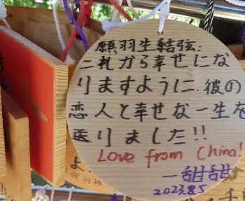 名前が似ていることからファンの間で「聖地」として知られる兵庫県神戸市の弓弦羽神社では、中国からと思われる熱烈ファンが絵馬を奉納。「これから幸せになりますように」と、この日の日付とともに日本語で書かれていた。