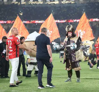 キックオフ前にピッチ上で名古屋のマスコットたちと大ヒット曲の「マツケンサンバ2」を披露。集まった5万5000人の観客が「オーレ!」の歓声で応えた。
