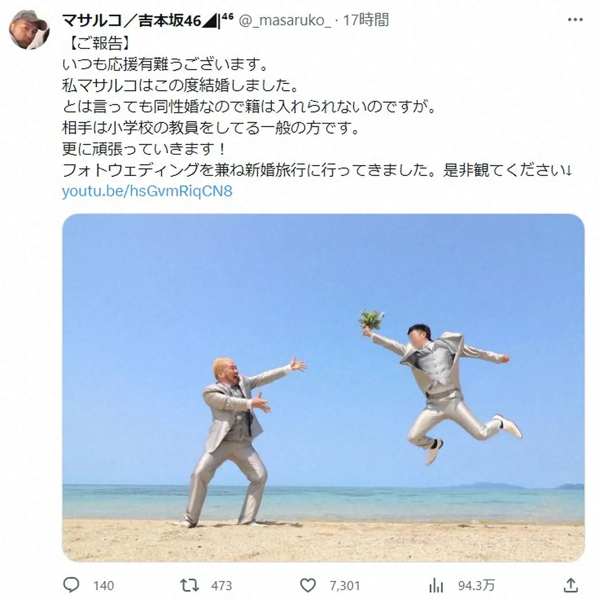 ゲイであることを公表しているマサルコは「いつも応援有難うございます。私マサルコはこの度結婚しました」と報告。「とは言っても同性婚なので籍は入れられないのですが」と伝えた。