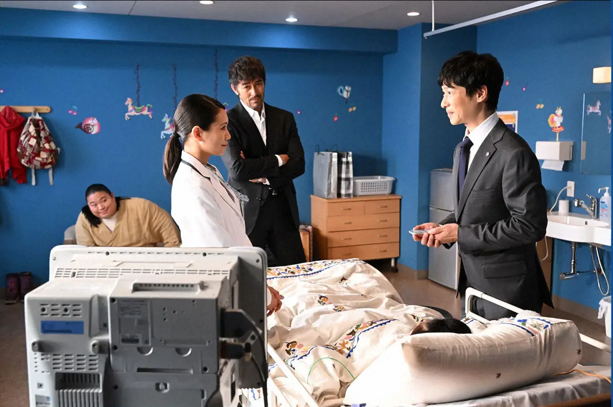 日曜劇場「VIVANT」第4話。モンゴルからジャミーンが来日し、病室に駆け付けた(右から)乃木憂助、野崎守、柚木薫、ドラム(C)TBS
