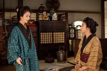 連続テレビ小説「らんまん」第93話。中尾(小倉久寛)が説明した新聞小説の内容に、寿恵子(浜辺美波・左)は…(C)NHK