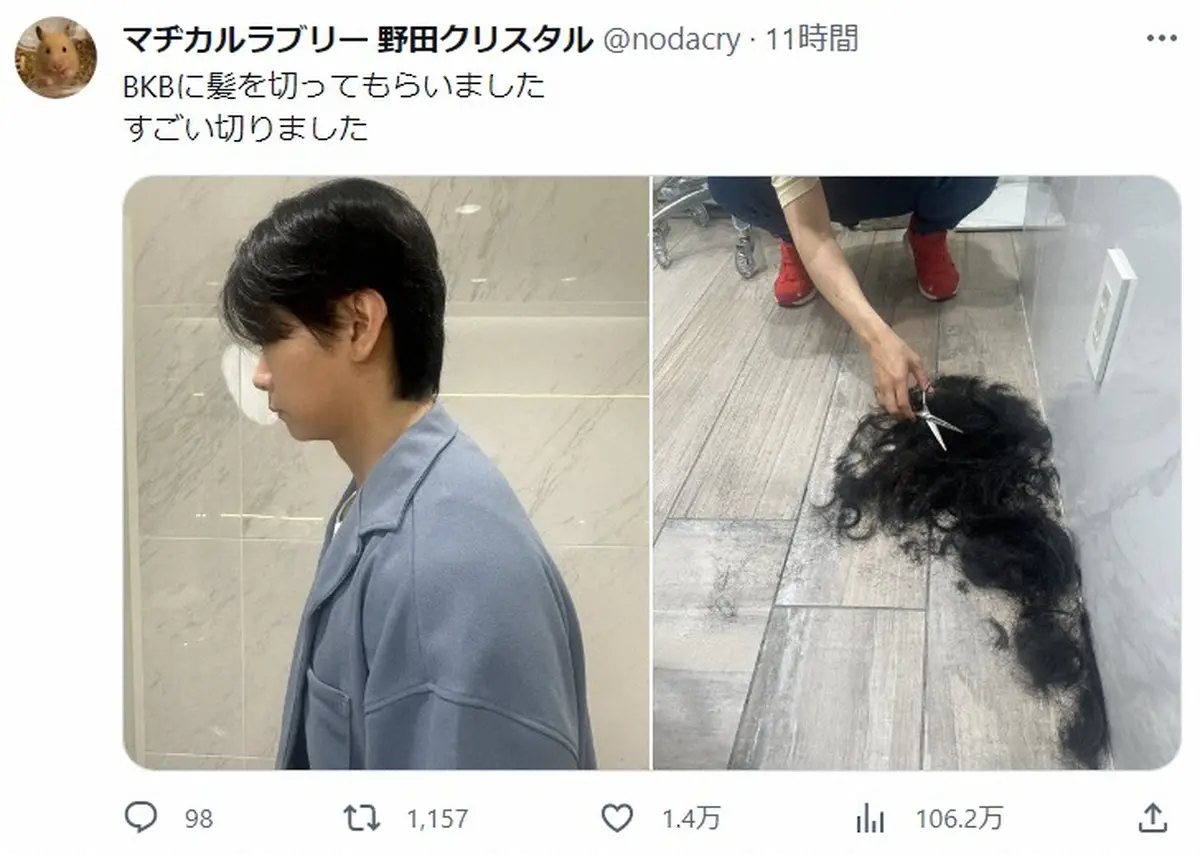 お笑いコンビ「マヂカルラブリー」の野田クリスタル(36)が9日、自身のX(旧ツイッター)を更新。新しい髪型を披露した。