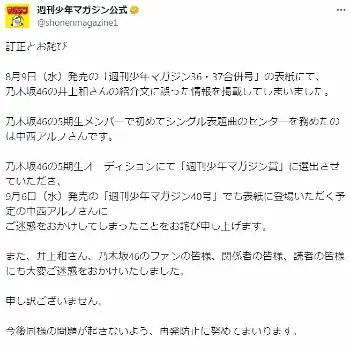 週マガ公式は「8月9日(水)発売の『週刊少年マガジン36・37合併号』の表紙にて、乃木坂46の井上和さんの紹介文に誤った情報を掲載してしまいました」と、乃木坂46・井上和が表紙を務める合併号に誤記があったことを報告した。