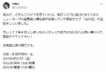 さらに北海道出身のロックバンド「GLAY」のTERUが、「先ほど、どさんこワイドを見ていたら、先日ライブに遊びに来てくれたニューヨークの屋敷君と嶋佐君が出演していて単独ライブ"虫の息"の宣伝をしていました」と投稿。「そして土下座を見てしまったので少しでもお力になれたらと思い僕からも宣伝させてください!」と、公演情報などを掲載した。
