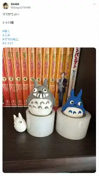 DAIGOが「ママがうまい トトロ編」のコメントを添えて投稿したのは、人気アニメ映画「となりのトトロ」に登場する「トトロ」を粘土で作ったもの。大中小3体のトトロが透明なテープのロールの上に飾られており、その奥には、北川が主演したドラマ「女神の教室~リーガル青春白書~」のアクリルスタンドが見えている。