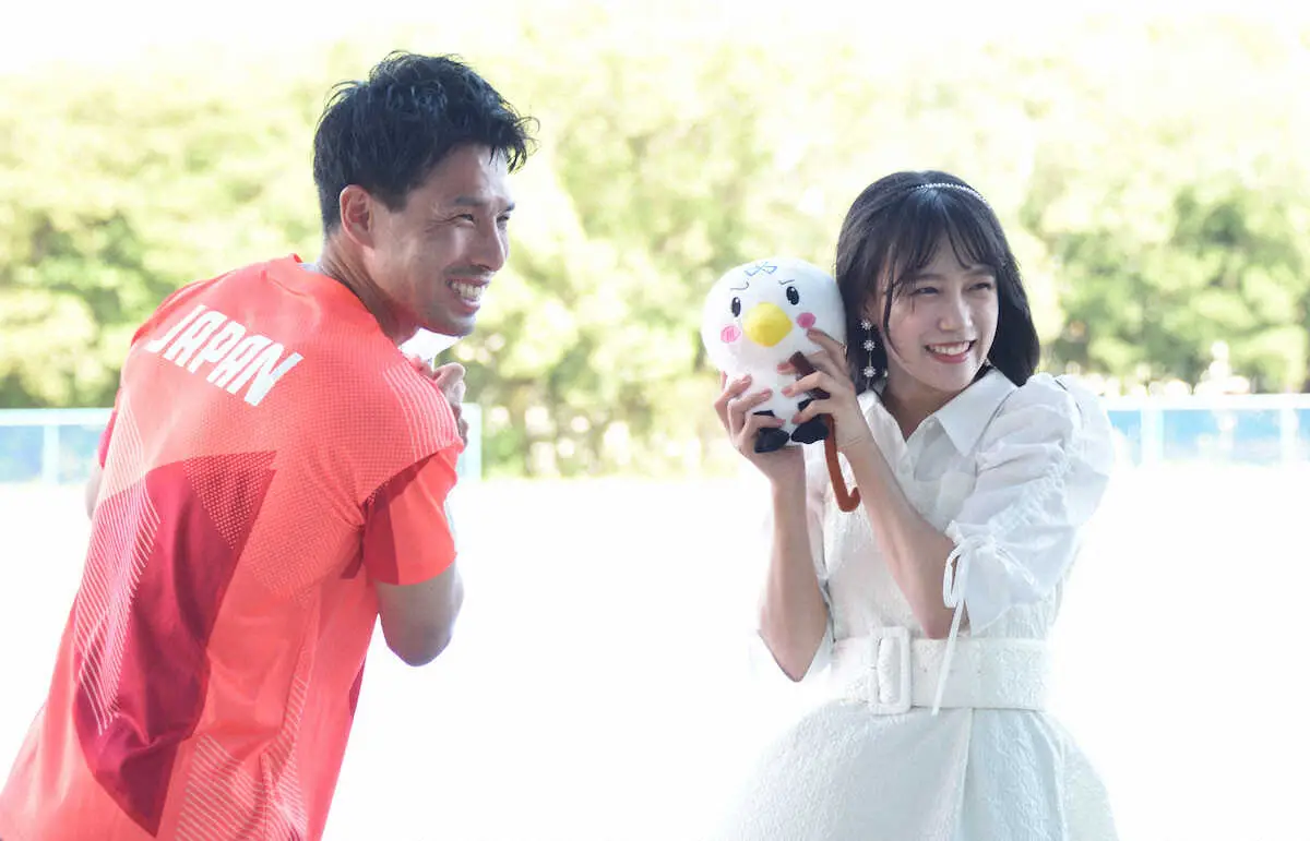 元日本代表の田中健太氏(左)と、ホッケーアンバサダーの「つばきファクトリー」河西結心