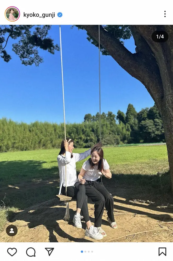 「#夏休み っぽいこと 岩田と一緒にデイキャンプ」と記すと、木につるされたブランコに白のロングTシャツ、黒のスパッツ、白のスニーカー姿の郡司アナと、白のTシャツ、黒のパンツ、白のサンダル姿の岩田アナが並んで座り、笑顔を見せるショットをアップ。