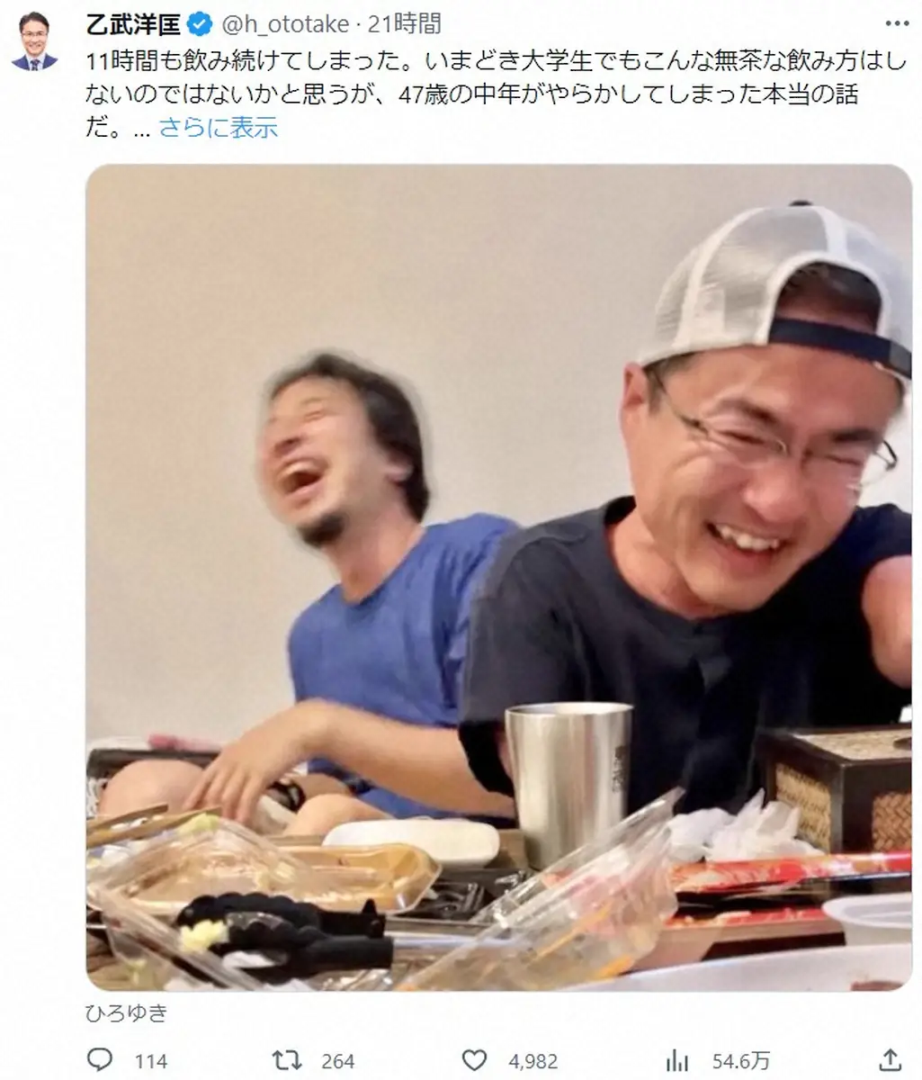 乙武氏は「11時間も飲み続けてしまった。いまどき大学生でもこんな無茶な飲み方はしないのではないかと思うが、47歳の中年がやらかしてしまった本当の話だ」と、飲み会が大盛り上がりしたことを投稿。2人で大笑いしている写真をアップした。