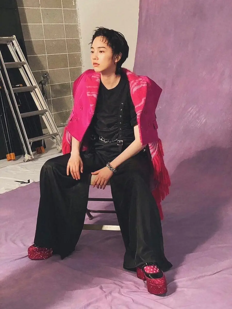 この日もブログを更新すると「オフショットー。と本誌」と、ショートヘアスタイルに黒のトップス、黒のパンツ、ピンクのジャケットを合わせたコーディネートで撮影する姿を複数枚公開した。