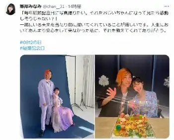 アイドルグループ「AKB48」の元メンバーでタレントの峯岸みなみ(30)が14日までに自身のX(旧ツイッター)を更新。結婚記念日を祝うショットを披露した。