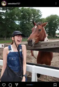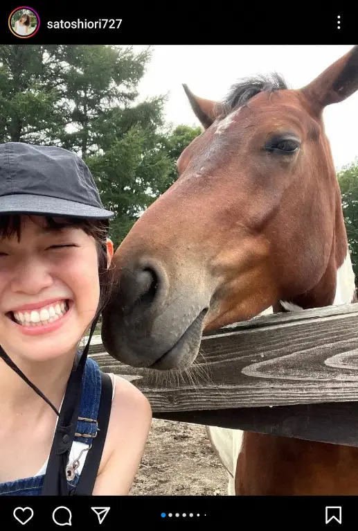 「なつやすみ 涼しいと思ったらとっても暑い~水分とってとって楽しみましょう」とつづり、白のタンクトップ、デニムのオーバーオール姿で笑顔で馬と触れ合っている写真などをアップした。