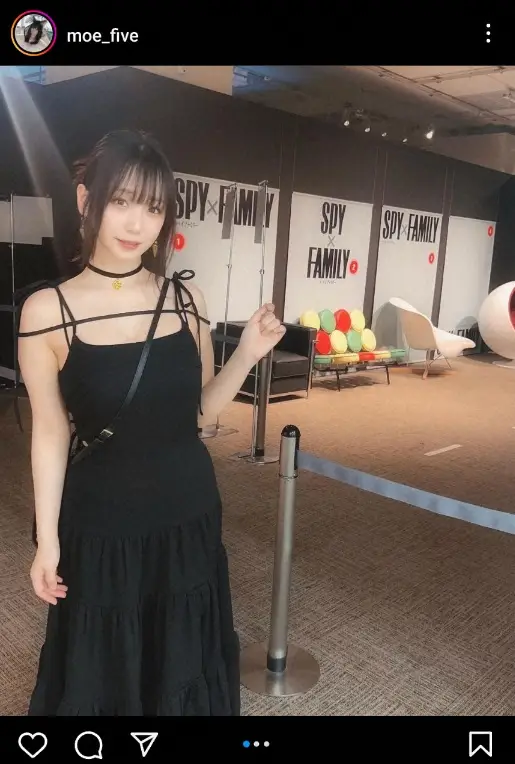 「スパイファミリー展を観てきたよ~!なんとご厚意で閉館後にゆっくり見せて頂けることになって感動でした!めちゃめちゃ行きたかったから凄い嬉しかった」と報告。黒のキャミワンピ姿の写真をアップし「私服でヨルさんイメージしたコーデでチョーカー自作なの~!」とつづった。