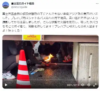 富士登山を巡っては、外国人観光客による迷惑行為も告発されている。同ガイド団体は以前にも、5合目に設置された仮設休憩所のプレハブ下で火器を使用するという危険極まりない行為を投稿し「言い逃れできないよう撮影してから注意しましたが、こんな状態で火器を使用し、吸ったタバコもそこでポイ捨て、常軌を逸してます!プレハブに引火したら死人出ますよ!狂ってる!」と怒りをあらわにしていた。