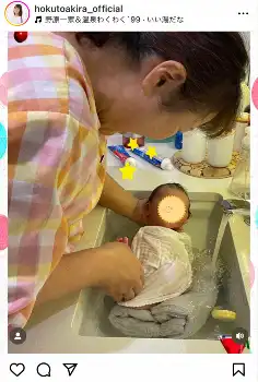 北斗は「20年ぶりの新生児のお風呂」とつづり、赤ちゃんに水をかける様子をアップ。「それも産まれたてホヤホヤ。おっかなかったーーーー」と振り返った。