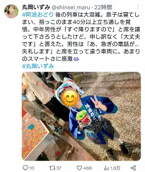 徳島県出身の丸岡は「阿波おどりの帰りの列車は大混雑。はしゃいでた息子は寝てしまい、抱っこしたまま40分以上の立ち通しを覚悟した」とつづり、阿波おどりの法被を着た長男の写真を投稿。