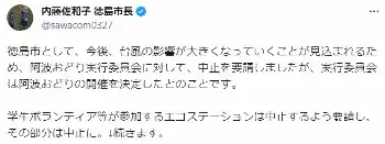 強行開催されたことについて、内藤市長は自身のX(旧ツイッター)に「徳島市として、今後、台風の影響が大きくなっていくことが見込まれるため、阿波おどり実行委員会に対して、中止を要請しましたが、実行委員会は阿波おどりの開催を決定したとのことです」と投稿。「学生ボランティア等が参加するエコステーションは中止するよう要請し、その部分は中止に。他の部分(ノボリの撤去等)についてもできる限り、被害が起きないよう、要請しています」と説明した。