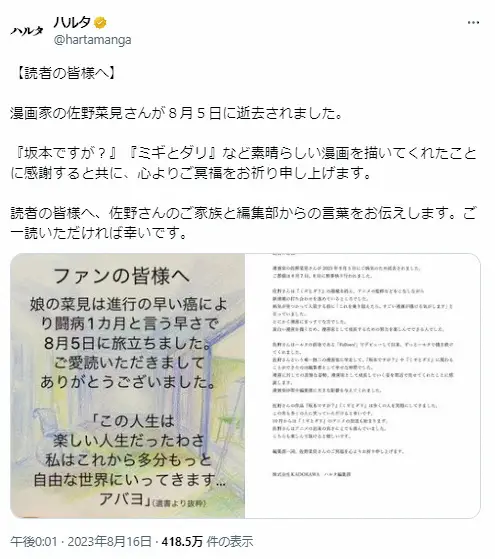 「ハルタ」アカウントでは「漫画家の佐野菜見さんが8月5日に逝去されました。『坂本ですが?』『ミギとダリ』など素晴らしい漫画を描いてくれたことに感謝すると共に、心よりご冥福をお祈り申し上げます。読者の皆様へ、佐野さんのご家族と編集部からの言葉をお伝えします。ご一読いただければ幸いです」と記載した。